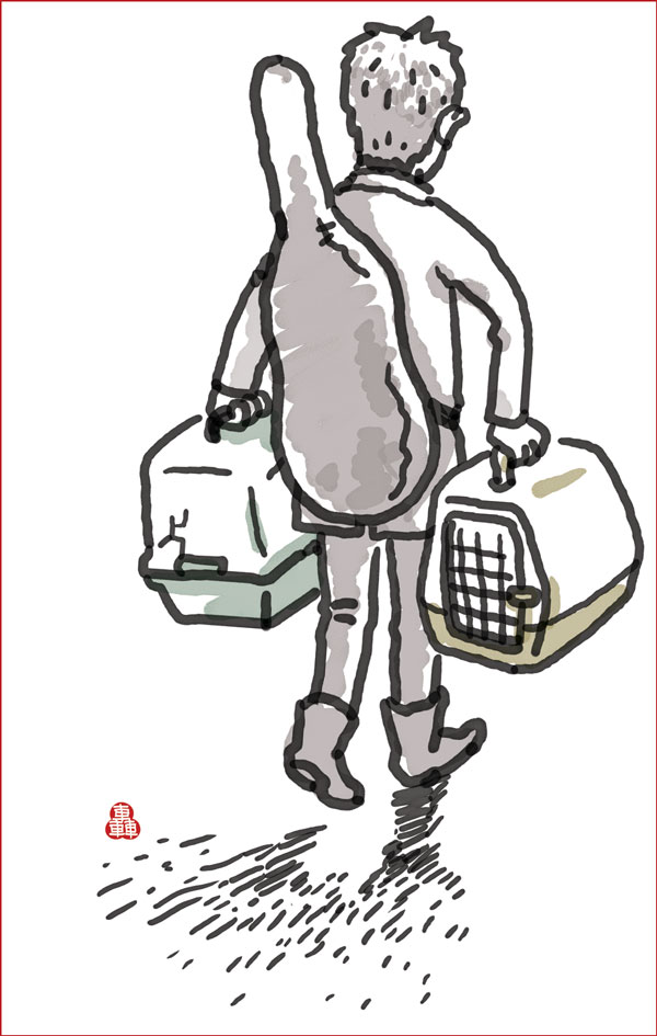 怪奇的是他手上拎著一個寵物提籃,還有一個有裂痕的貓砂盆....