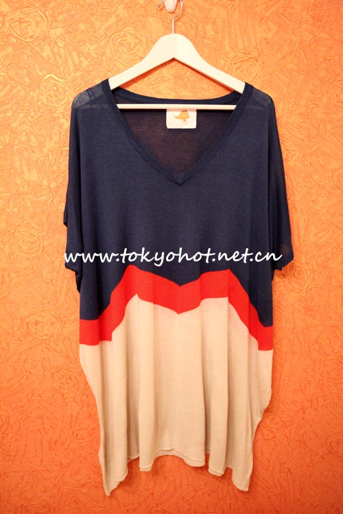 NO.26 寬松蝙蝠短袖拼色V領針織T