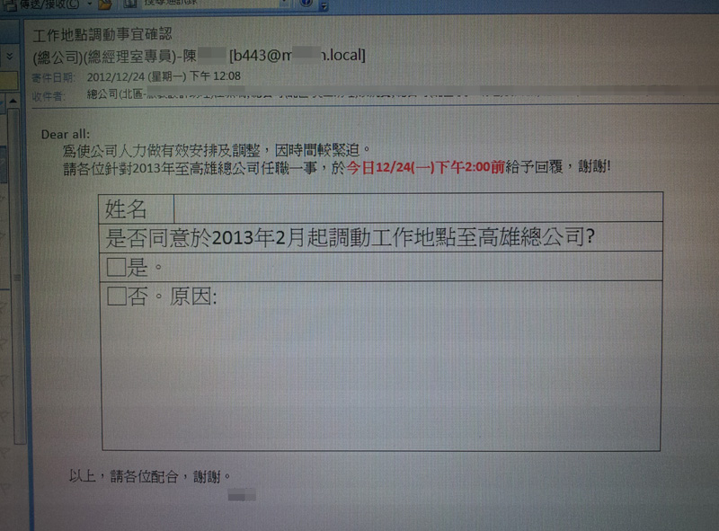 大意就是合約有載明我們必須接受職務調遷、老闆對大家很好到時候會幫我們在公司附近租套房、老闆對大家真的很好所以薪資還按照北部水平給付、老闆真的是佛新來著調職之後還有每月加給新台幣3000元整!!!!