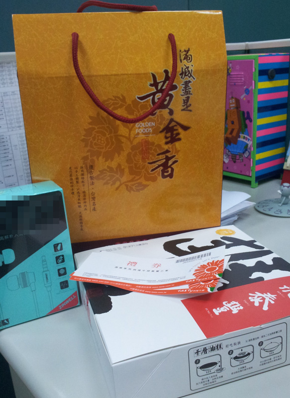 ↑今年的春節禮品:肉乾、鼎泰豐千層油糕、(本公司滯銷)高級耳機。